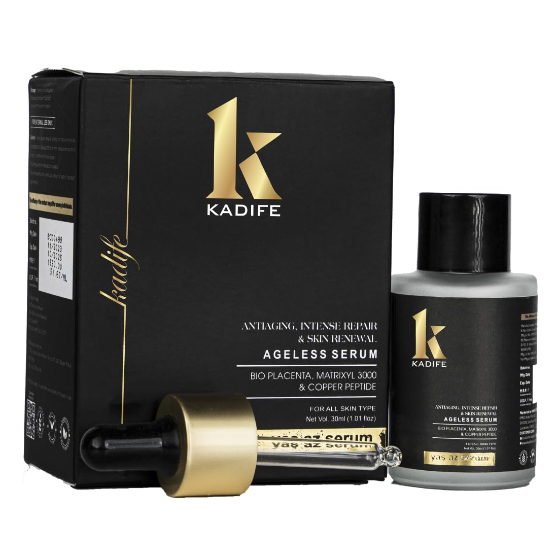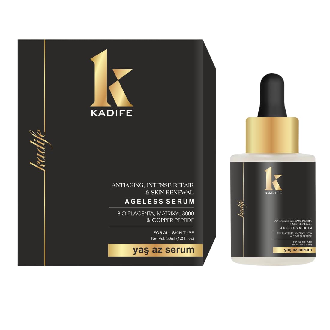 KADIFE Ageless anti aging face serum is designed to support skin repair renewal and radiance for men and women seeking advanced skincare solutions This lightweight serum is formulated with bio placenta growth factor matrixyl 3000 and copper peptide to help improve skin texture elasticity and overall tone Regular use helps reduce the appearance of fine lines wrinkles dark spots and uneven skin tone while supporting collagen production and natural regeneration The fast absorbing non greasy formula layers easily under moisturizers sunscreen or makeup making it suitable for morning and night routines Ideal for all skin types including dry oily and sensitive skin this skin reconstructing serum fits seamlessly into daily skincare rituals Apply a few drops to cleansed skin and gently massage until absorbed Order now to elevate your skincare routine or choose it as a thoughtful self care gift